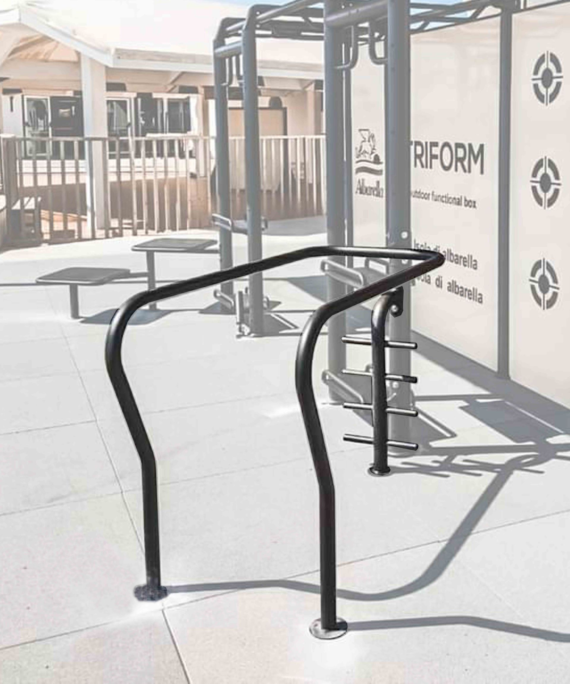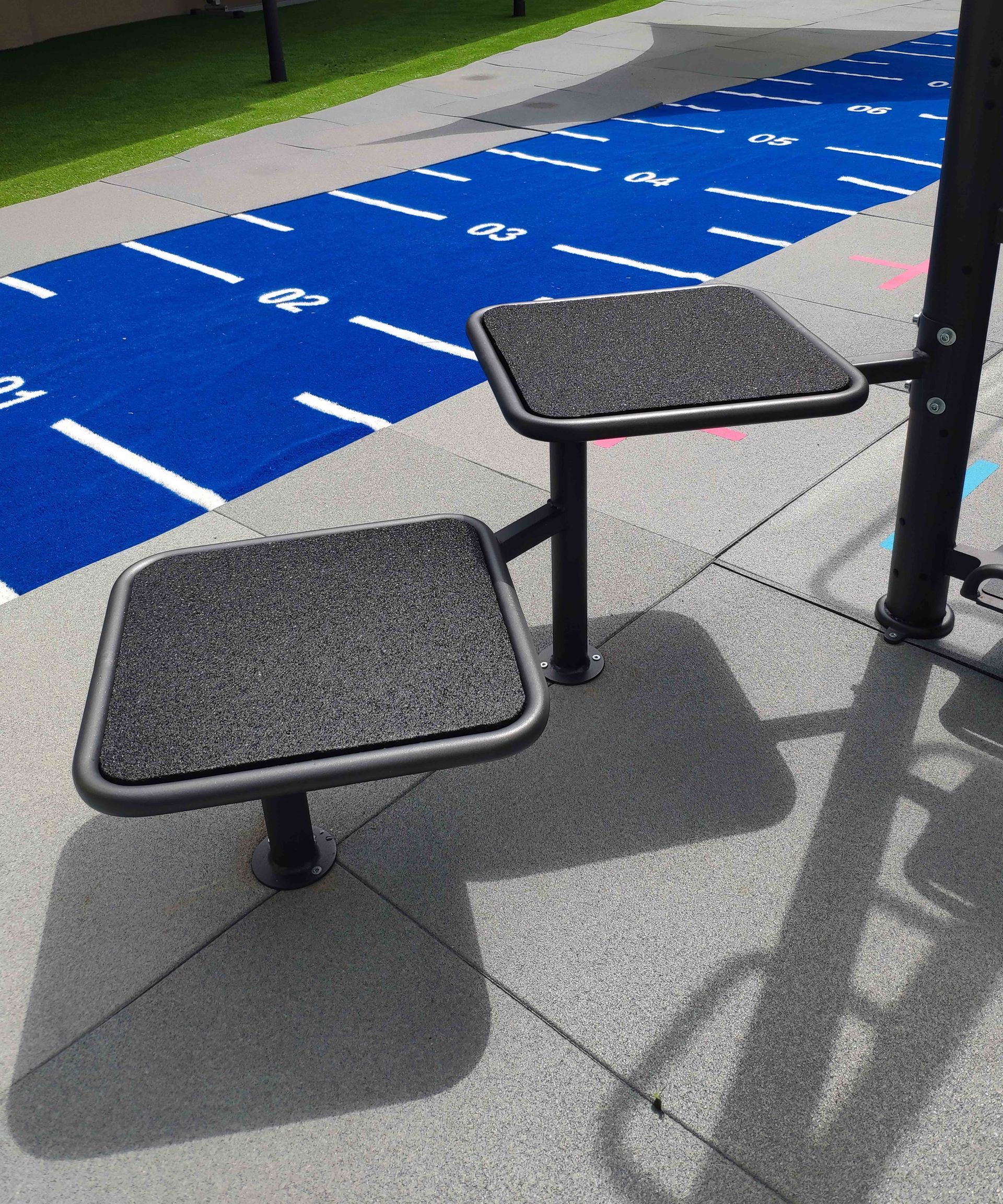 The TRIFORM Fixed Double Platform Step, with non-slip rubber, allows for various exercises to complement functional training and is recommended for all TRIFORM Station Outdoor models with cataphoresis treatment.