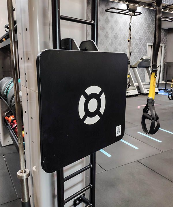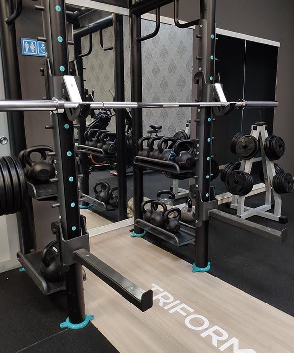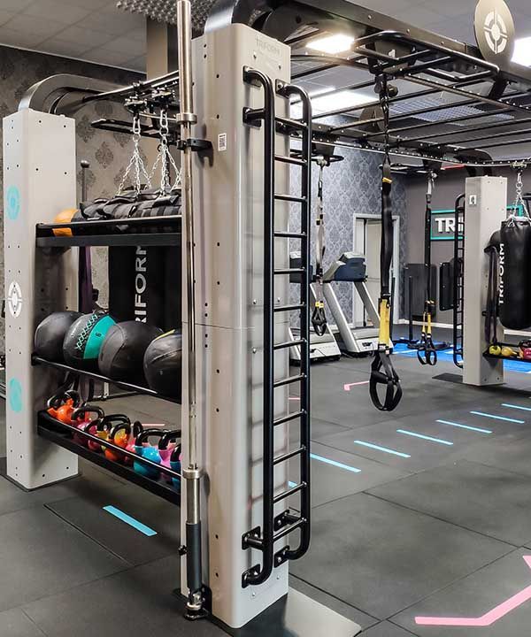 The TRIFORM Rack Module, equipped with two barbell hooks and two safety bars, allows for the addition of a rack workstation to compatible TRIFORM Stations.