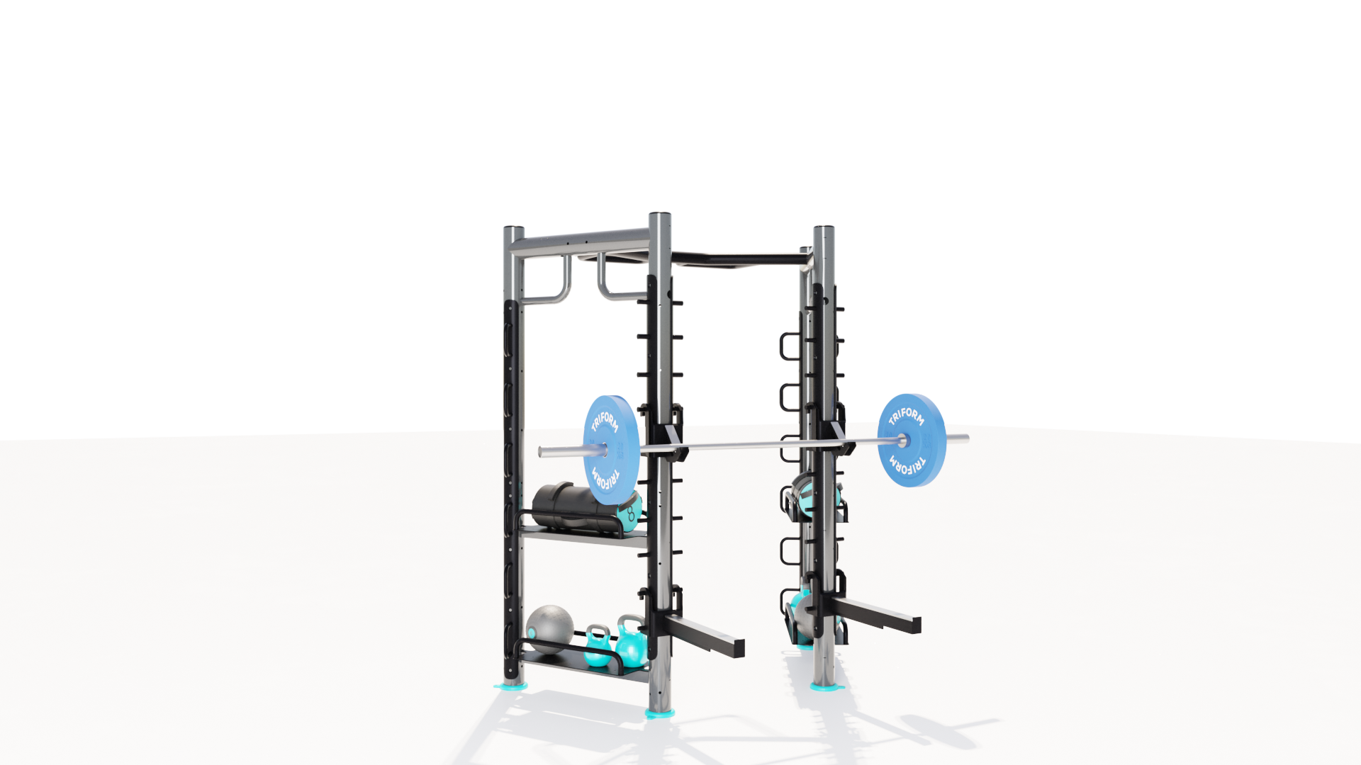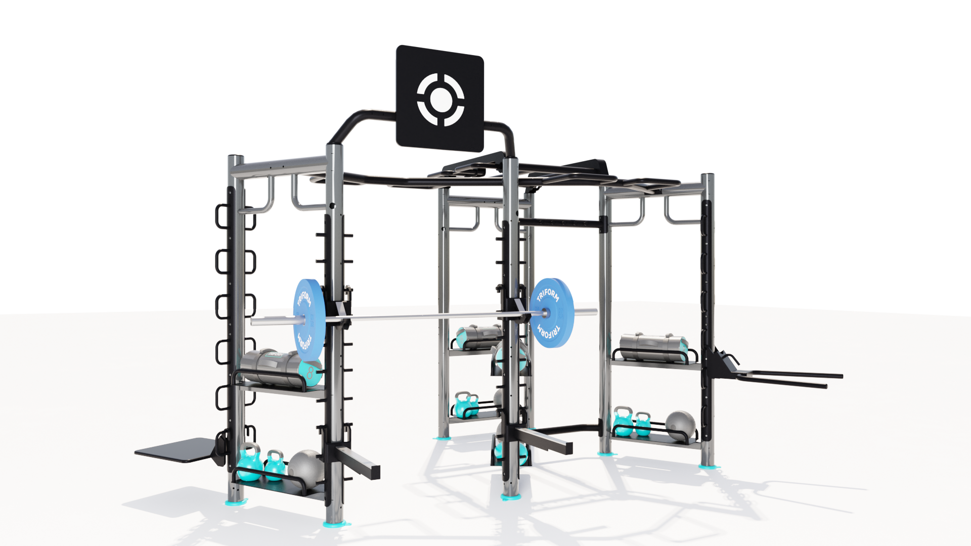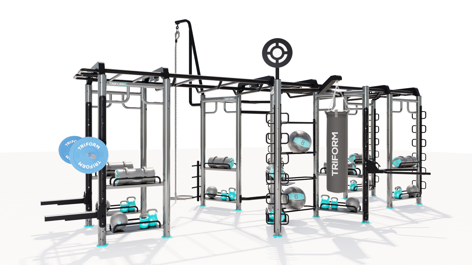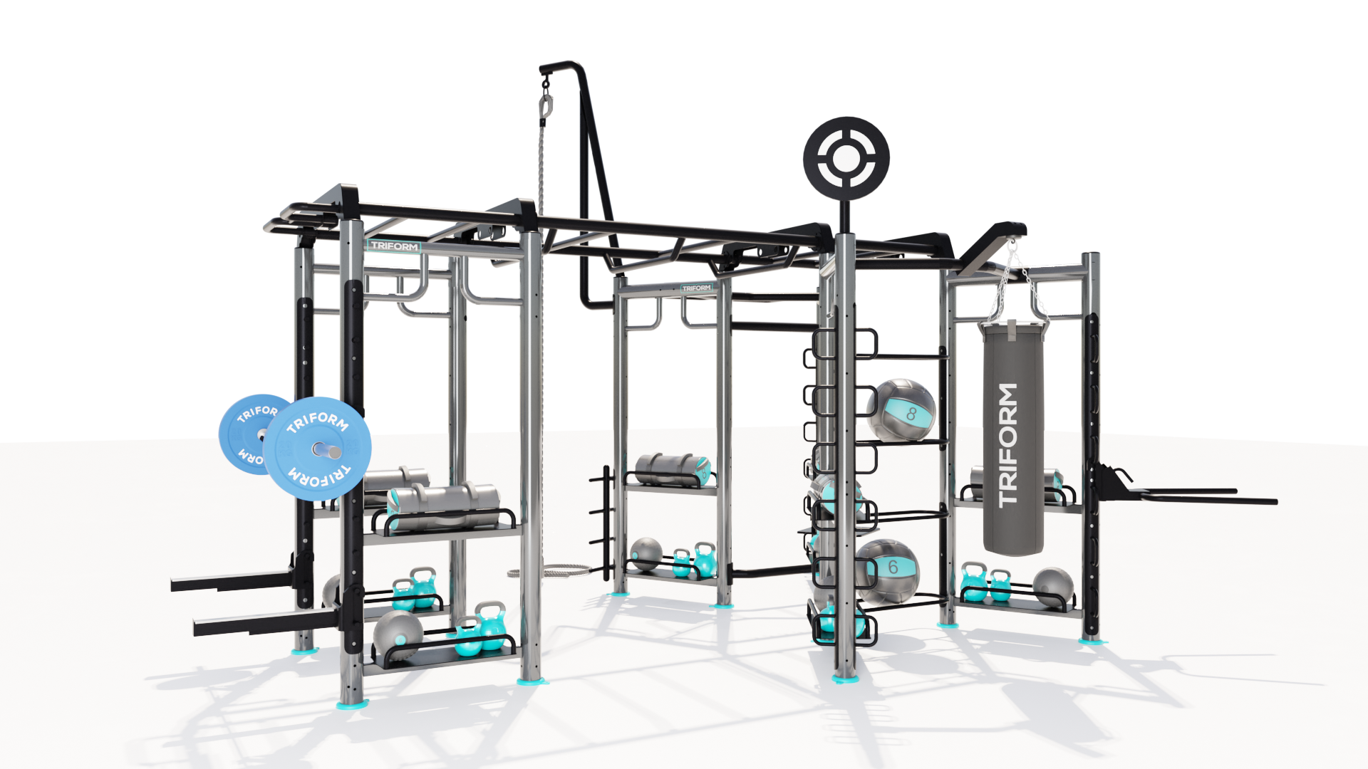 COMBO 8 TRIFORM is a complete functional room consisting of a combination of different TRIFORM Stations: 1 X-STATION + 2 MINI CASTLE LATERAL + 1 SUSPENSION BRIDGE + BARBELL RACK.