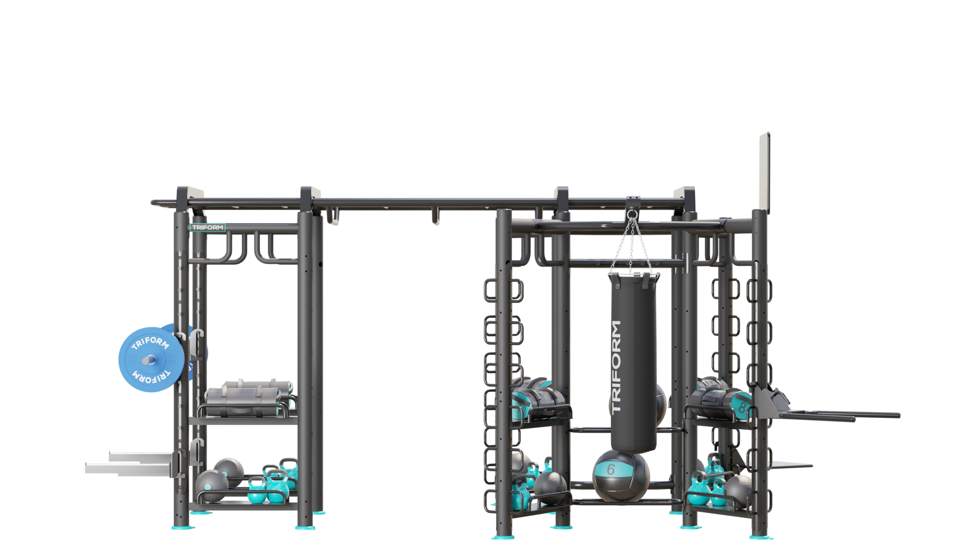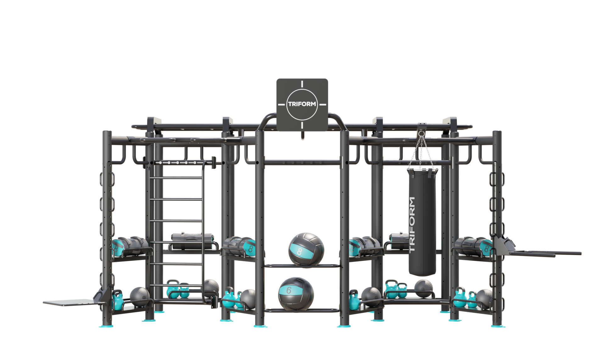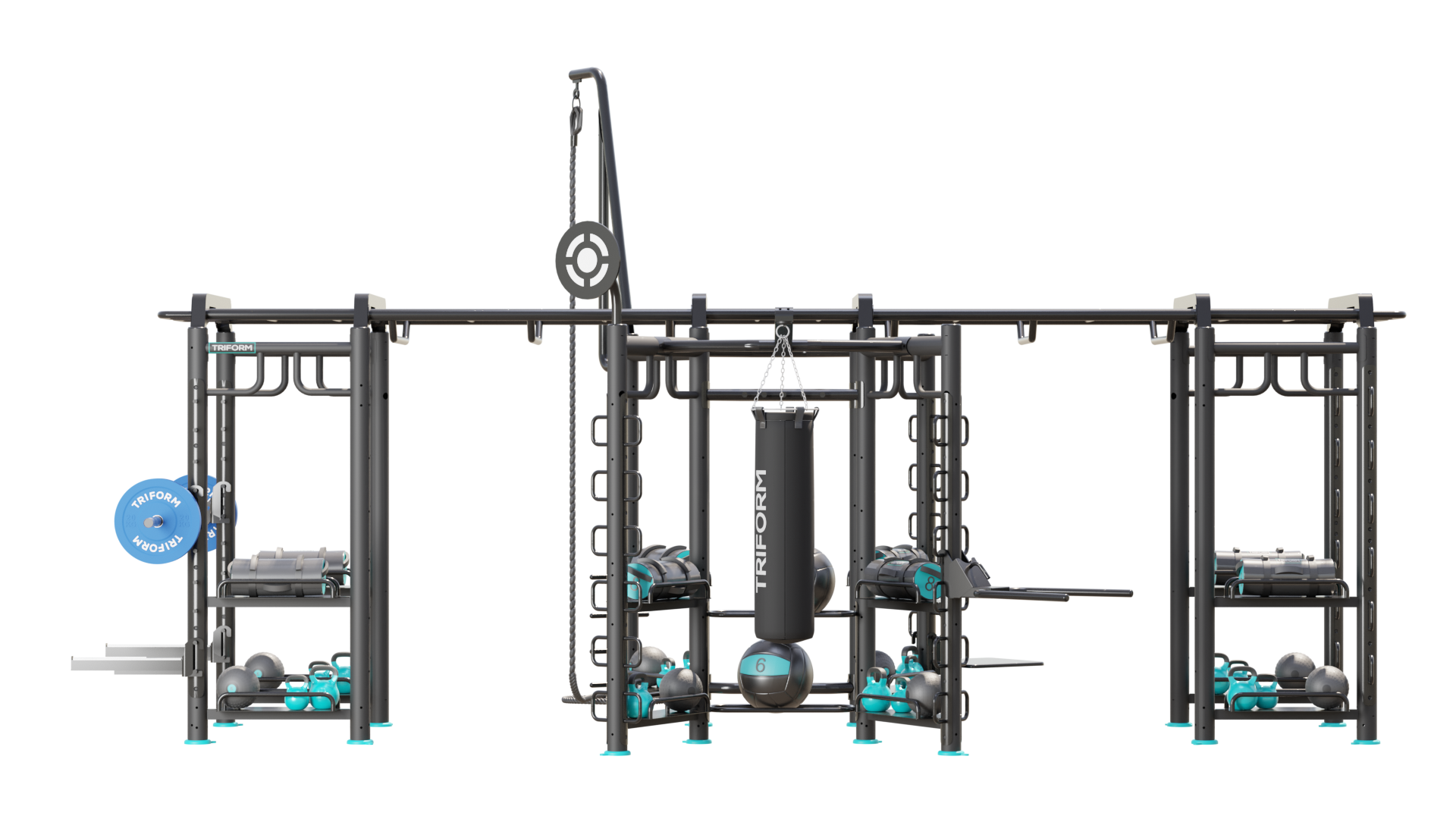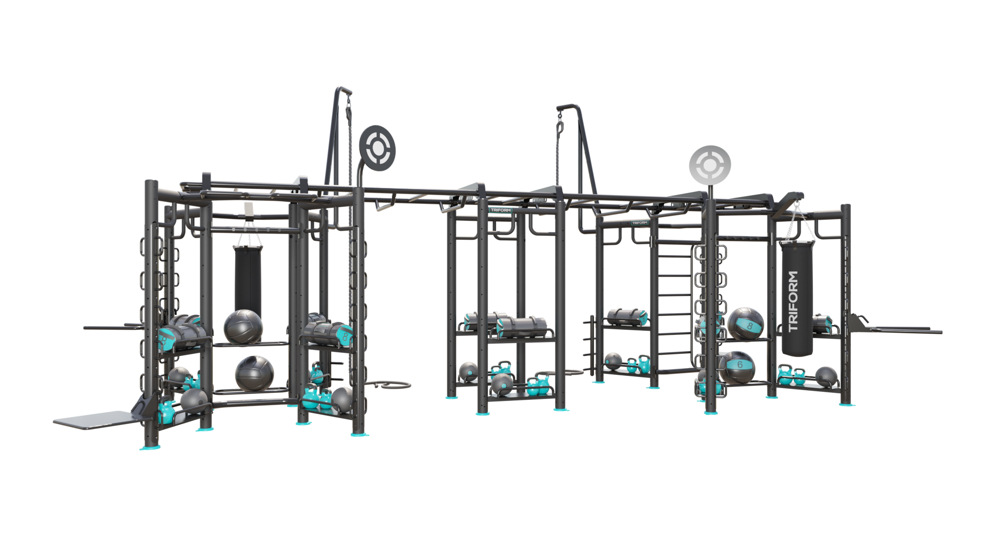 COMBO 8 TRIFORM è una sala functional completa costituita dalla combinazione tra diverse TRIFORM Station: 1 X-STATION + 2 MINI CASTLE LATERALI + 1 SUSPENSION BRIDGE + RACK BILANCIERI.