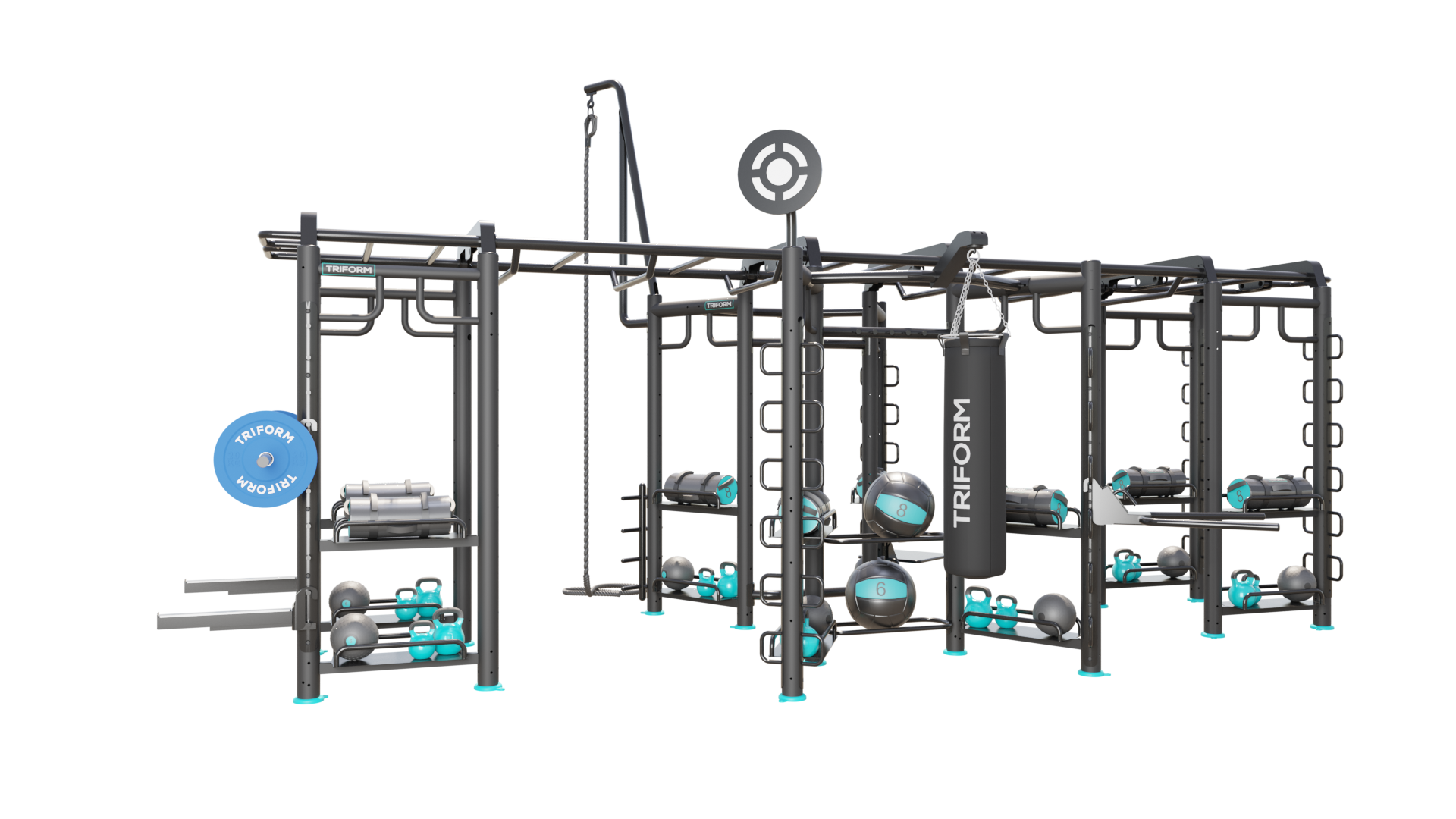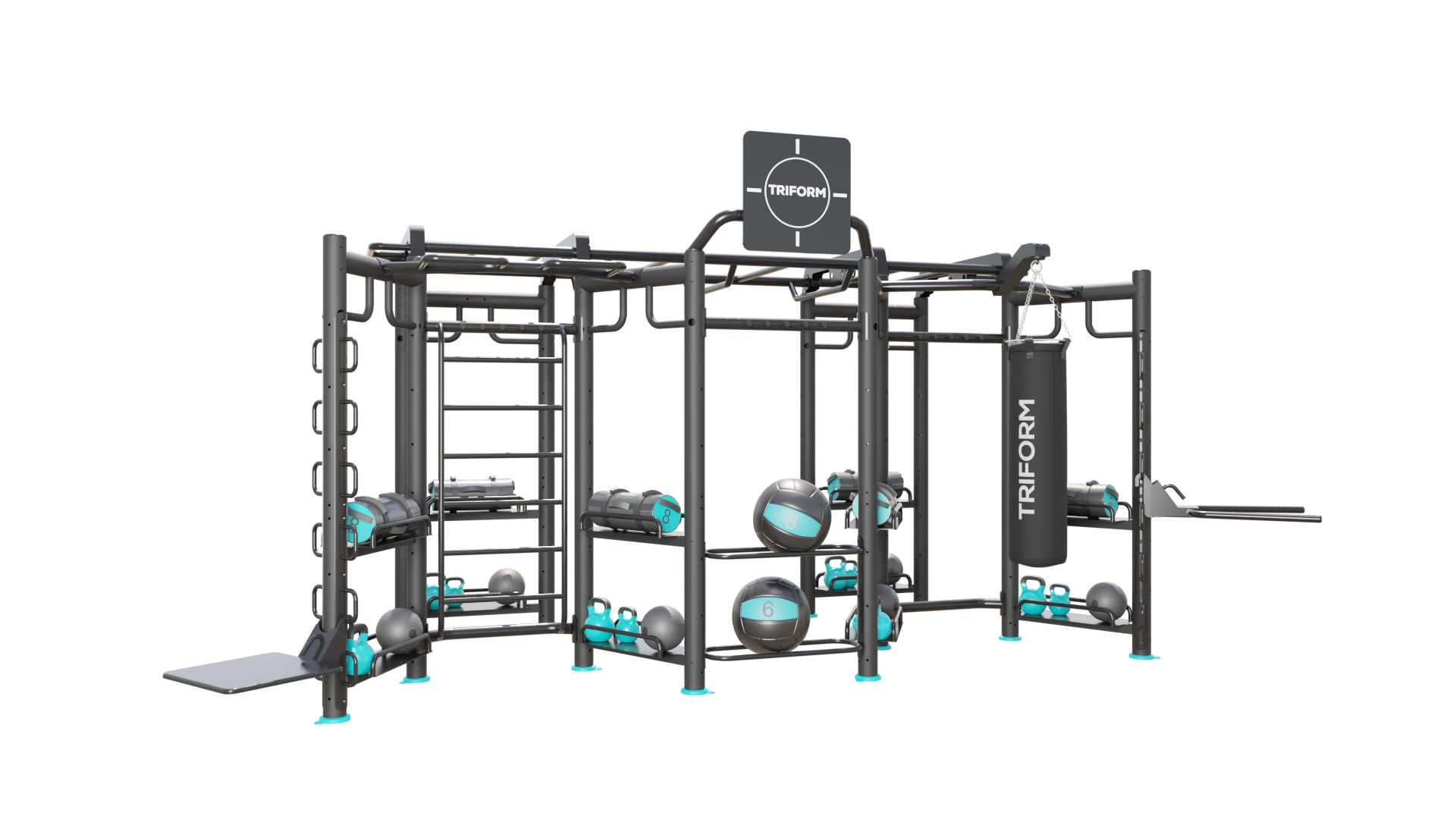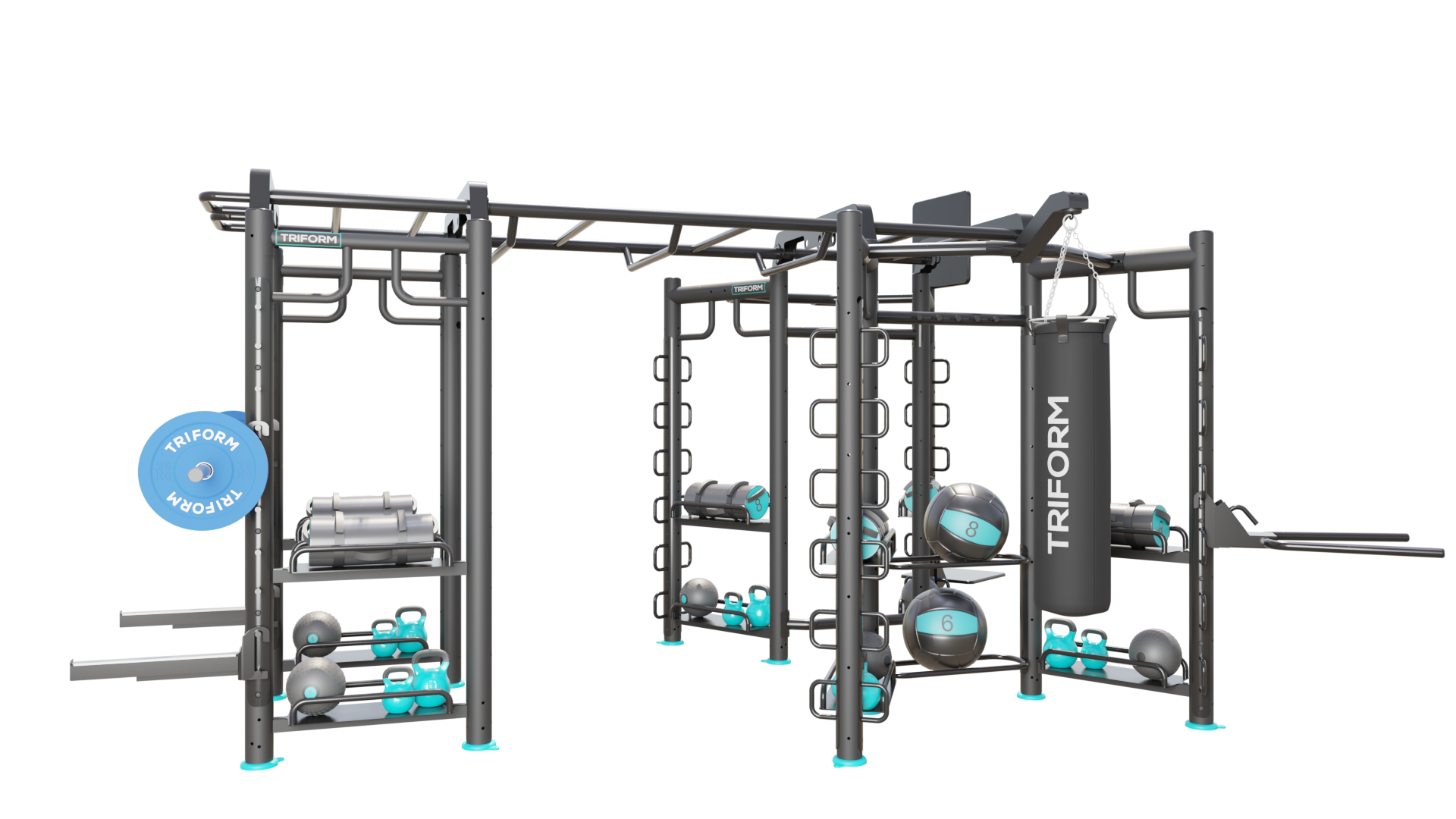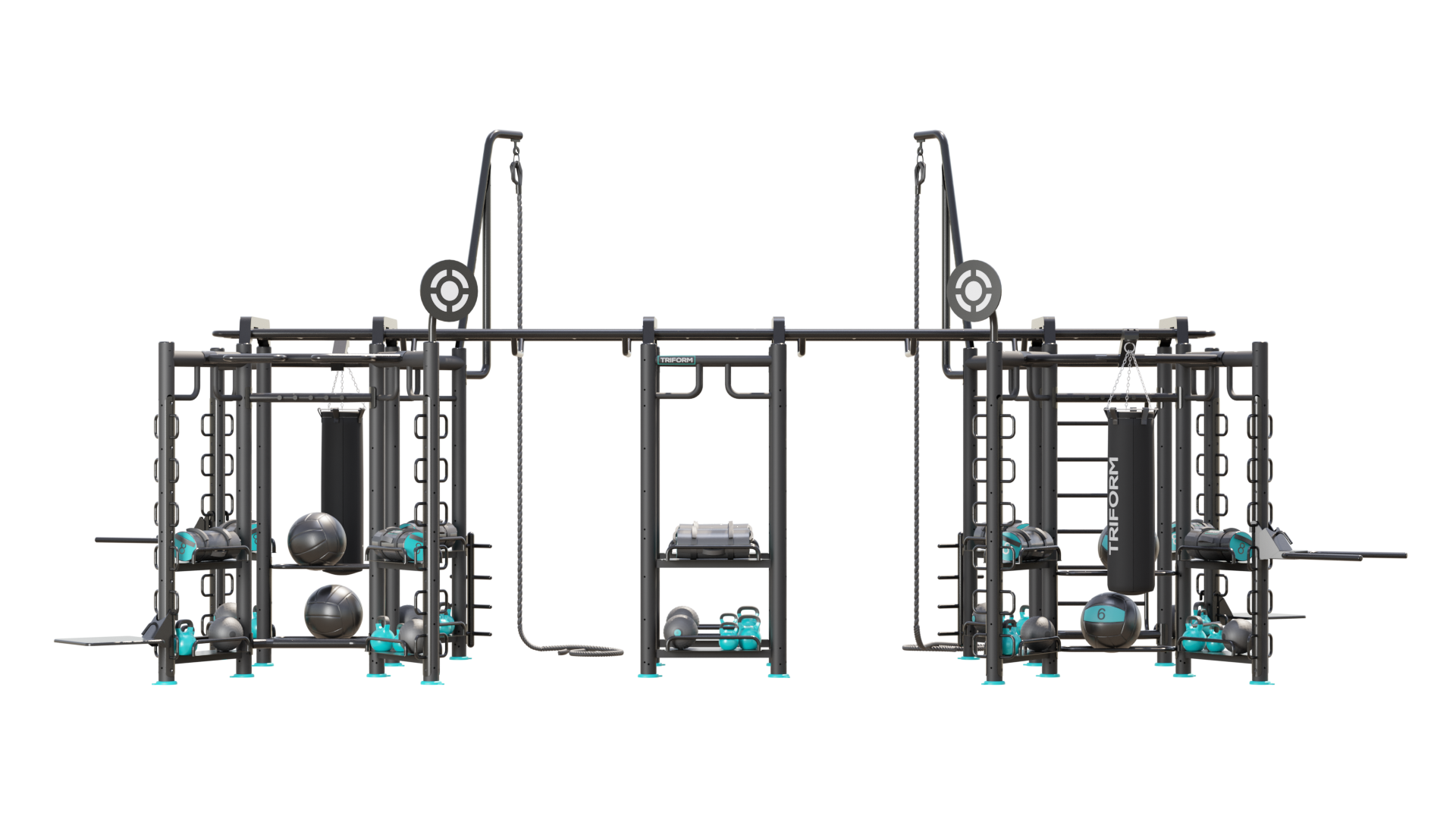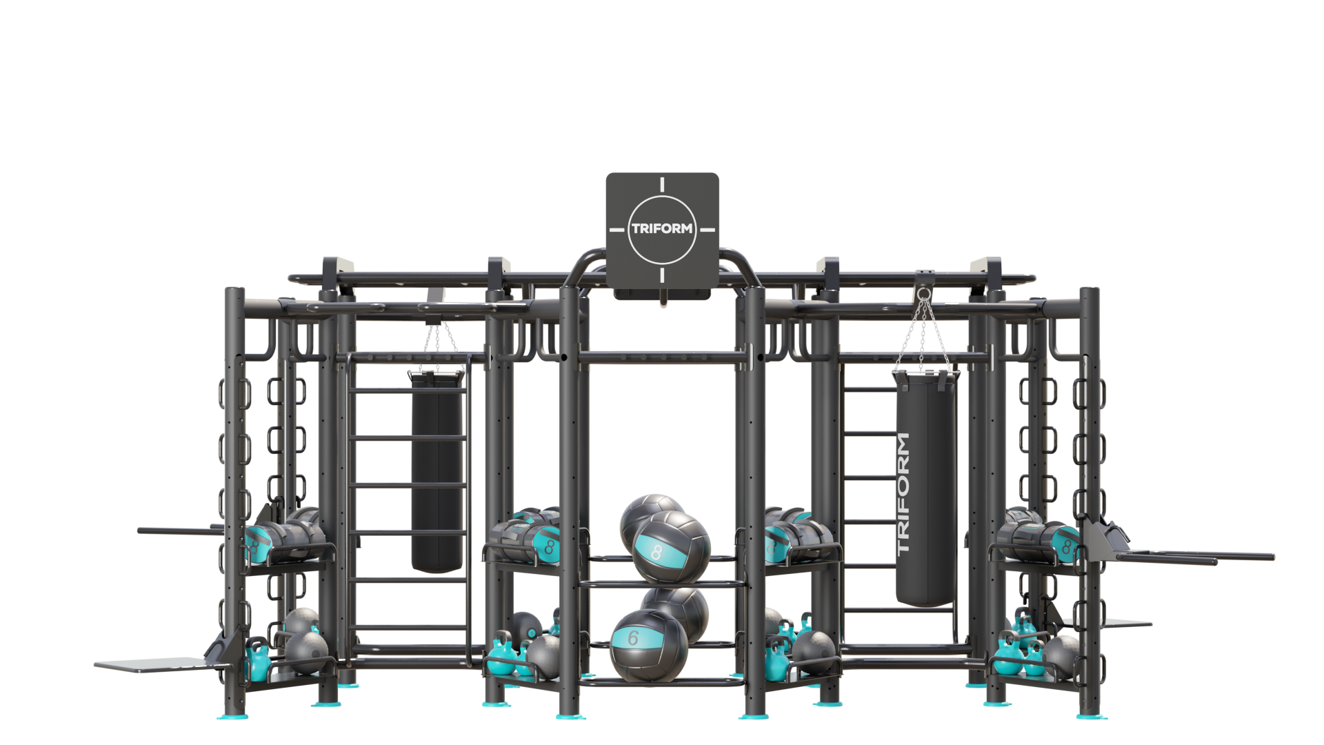 COMBO 8 TRIFORM è una sala functional completa costituita dalla combinazione tra diverse TRIFORM Station: 1 X-STATION + 2 MINI CASTLE LATERALI + 1 SUSPENSION BRIDGE + RACK BILANCIERI.