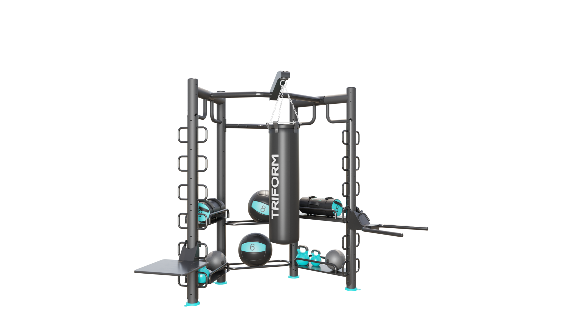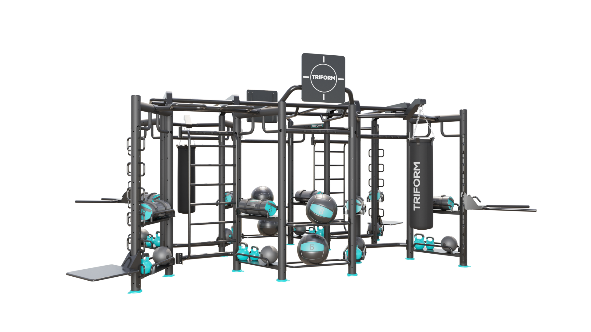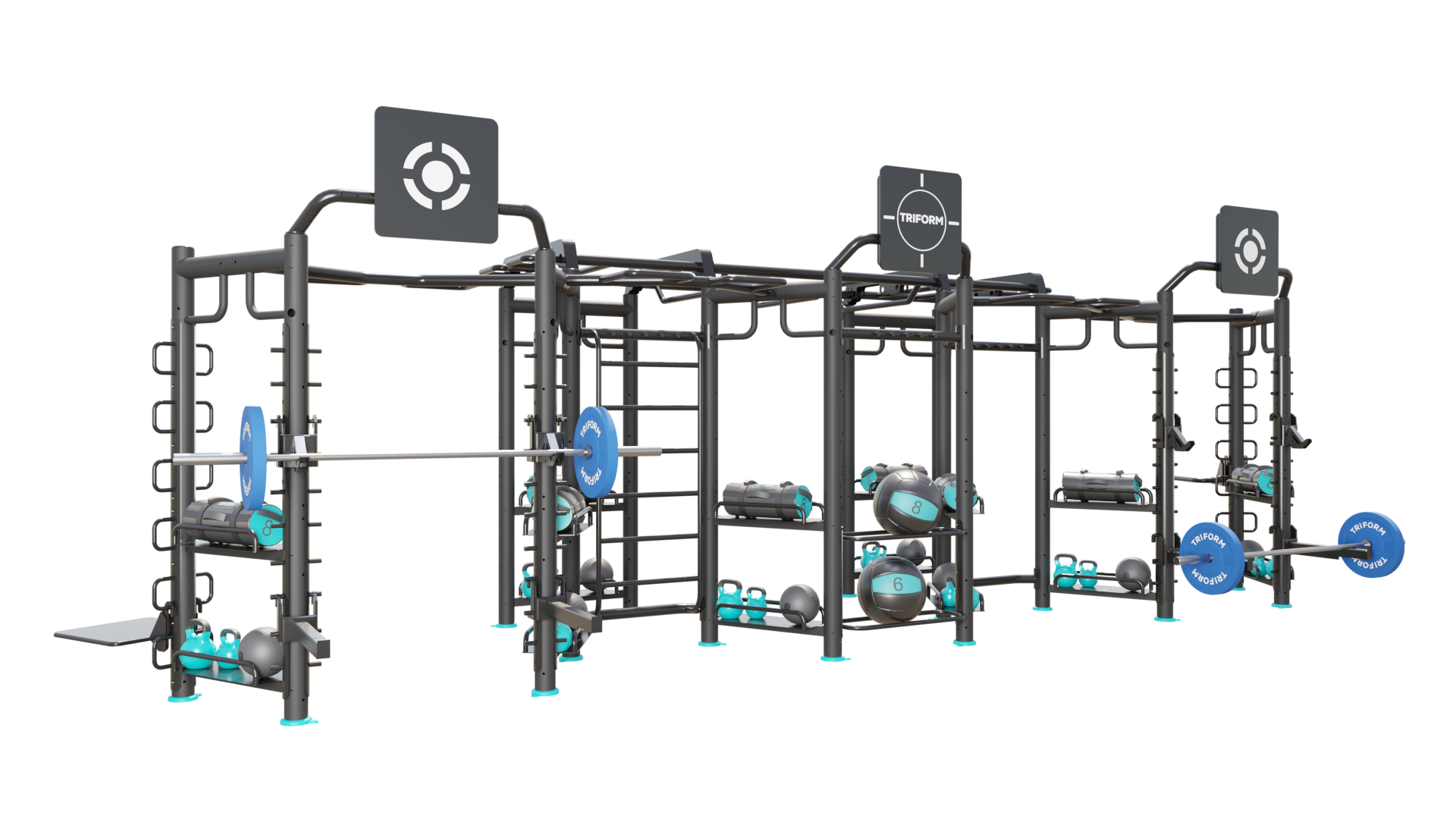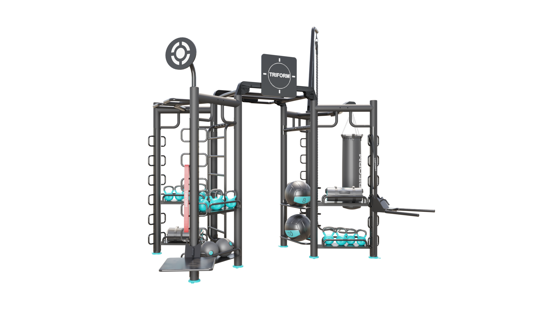 COMBO 8 TRIFORM è una sala functional completa costituita dalla combinazione tra diverse TRIFORM Station: 1 X-STATION + 2 MINI CASTLE LATERALI + 1 SUSPENSION BRIDGE + RACK BILANCIERI.