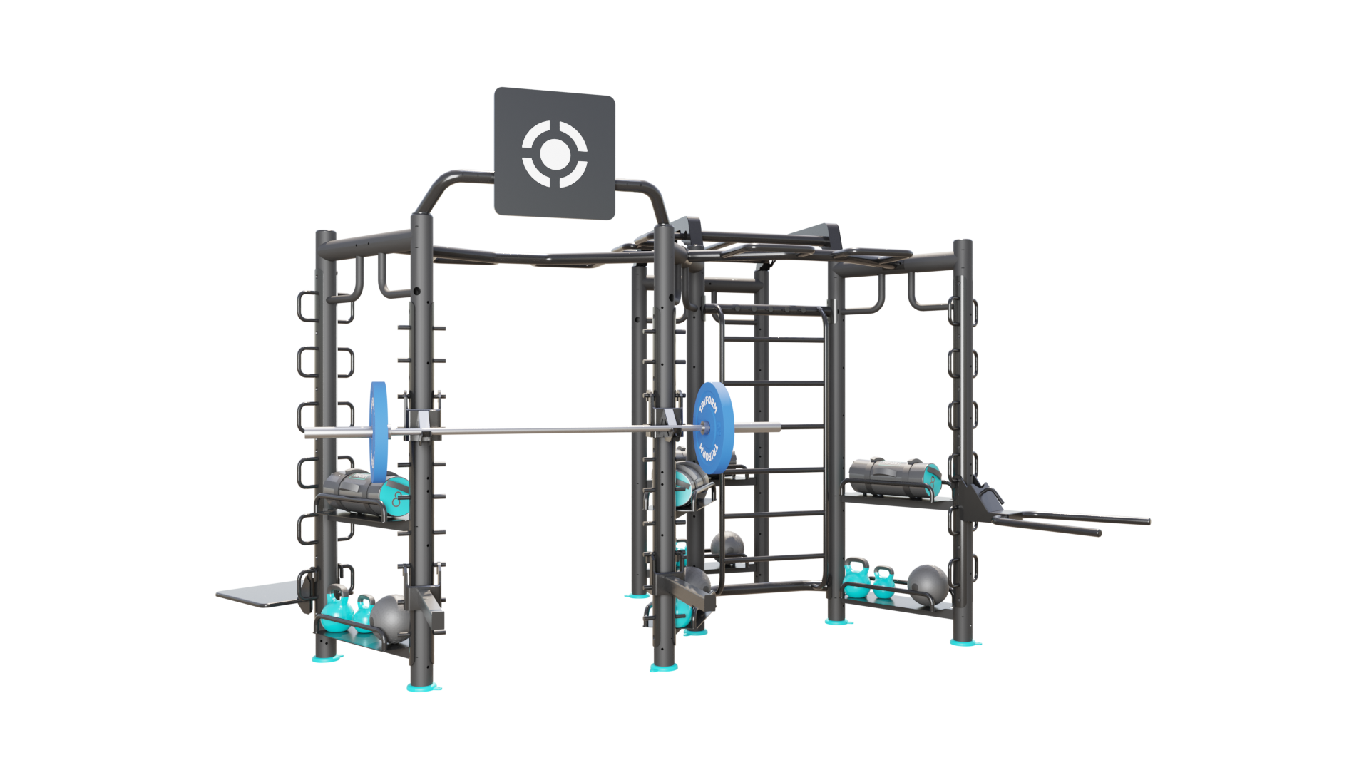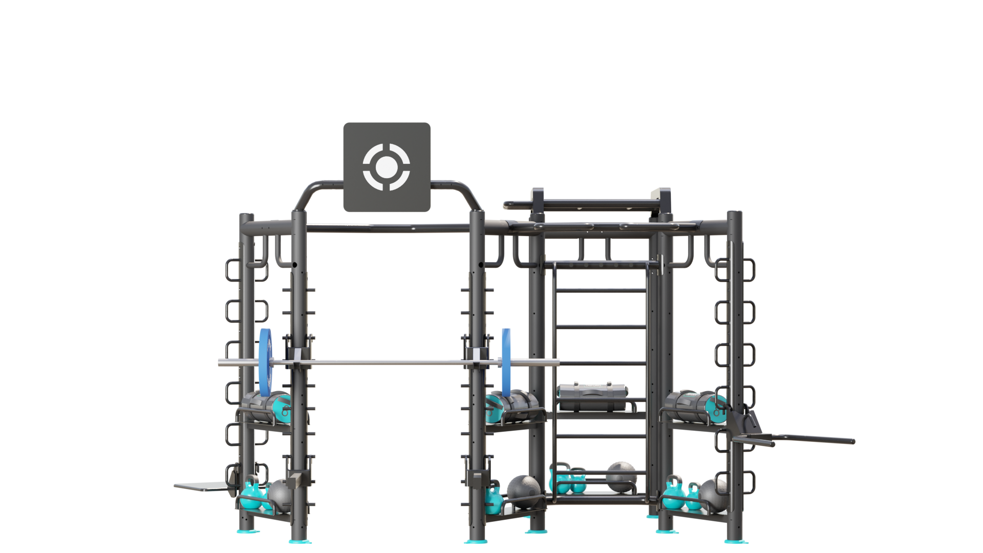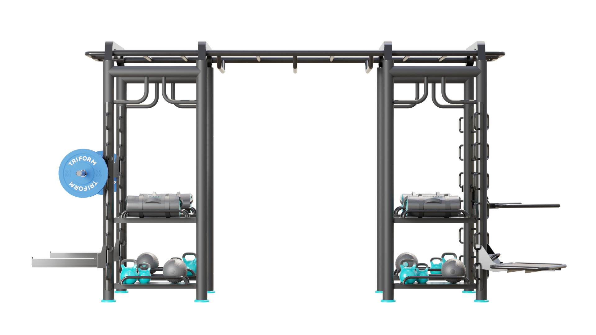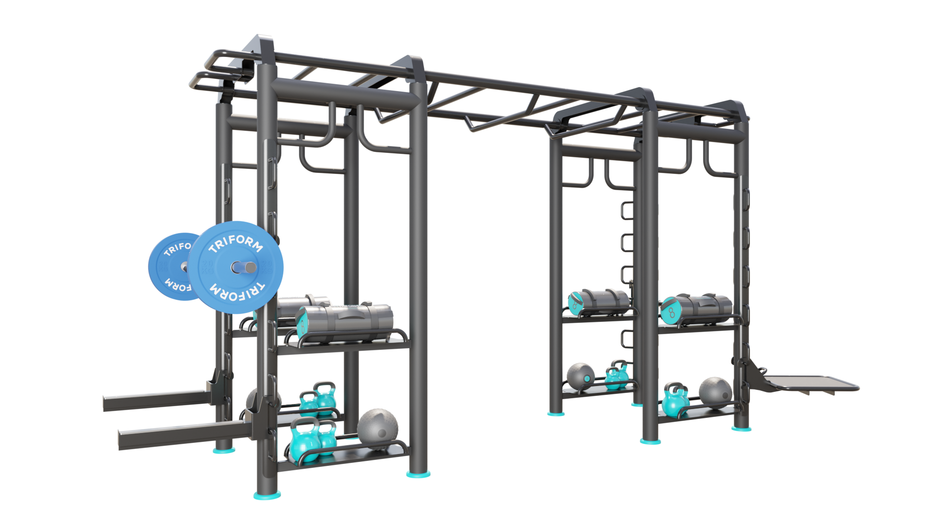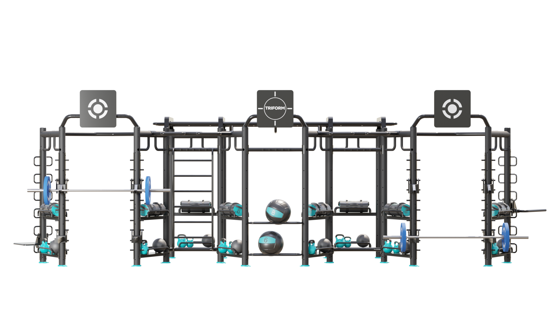COMBO 8 TRIFORM è una sala functional completa costituita dalla combinazione tra diverse TRIFORM Station: 1 X-STATION + 2 MINI CASTLE LATERALI + 1 SUSPENSION BRIDGE + RACK BILANCIERI.